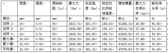 備 注: 寬度 厚度 原始標(biāo)距(Lo) 最大力(Fm) 抗拉強(qiáng)度(Rm) 規(guī)定非比例延伸強(qiáng)度 彈性模量 最大力總伸長(zhǎng)率(Agt) 斷后伸長(zhǎng)率(A)
