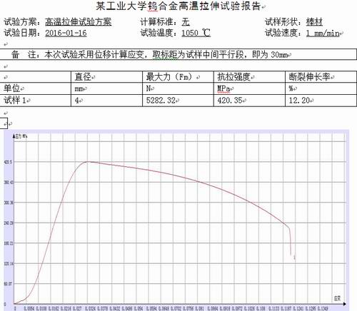 該客戶是國(guó)家的一所“211工程”重點(diǎn)建設(shè)院校,是國(guó)內(nèi)高溫合金領(lǐng)域的權(quán)威院校,此次委托我方做鎢合金高溫測(cè)試。鎢合金是以鎢為基加入其他元素組成的合金。在金屬中,鎢的熔點(diǎn)最高,高溫強(qiáng)度和抗蠕變性能以及導(dǎo)熱、導(dǎo)電和電子發(fā)射性能都好,比重大,除大量用于制造硬質(zhì)合金和作合金添加劑外,鎢及其合金廣泛用于電子、電光源工業(yè),也在航天、鑄造、武器等部門中用于制作火箭噴管、壓鑄模具、穿甲彈芯、觸點(diǎn)、發(fā)熱體和隔熱屏等。如下是該院校用三思泰捷試驗(yàn)機(jī)所做的鎢合金高溫拉伸試驗(yàn)相關(guān)報(bào)告及參數(shù):